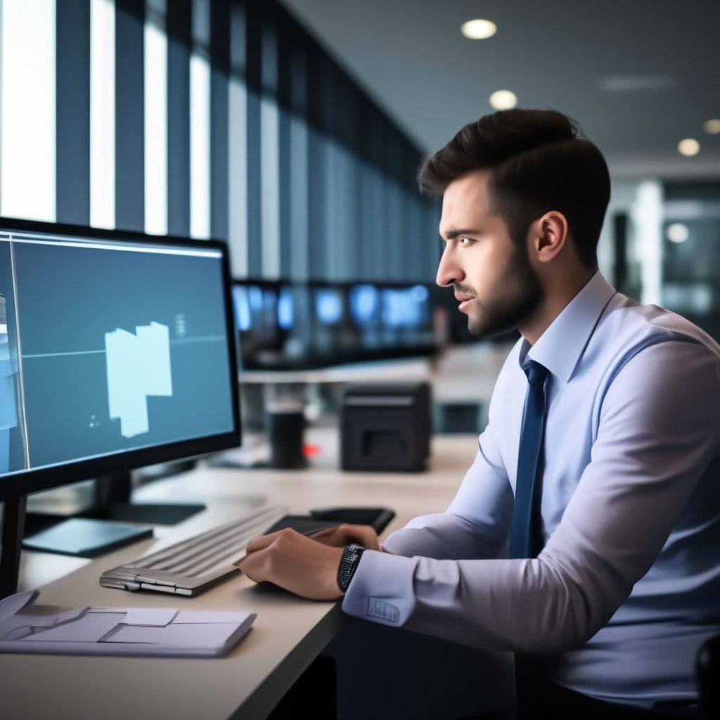 A man is working on a computer in an office, focused on achieving financial operations efficiency and fostering a positive and collaborative work environment.
