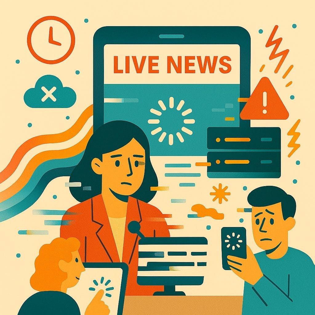 Illustration of breaking news broadcast disrupted by technical issues, with a concerned anchor, a frozen “Live News” screen, and people frustrated by slow-loading devices.